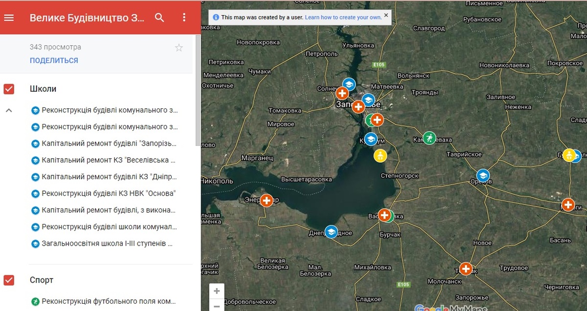 По всій області триває реалізація Програми Президента України Володимира Зеленського «Велике будівництво». Так, у Запорізькій області були відібрані важливі соціальні та інфраструктурні об’єкти, що будуть реконструйовані та відремонтовані в рамках Програми. Наразі з’явилась відкрита мапа з усіма об’єктами, що були відібрані в рамках Програми. Її можна знайти за посиланням. На мапі є розділи: школи, дошкільні навчальні заклади, спортивні об’єкти, культура та приймальні відділення. Натиснувши на кожен об’єкт, можна прочитати коротку довідку про нього. Інформація буде оновлюватись. Так, на карту нанесено: 9 шкіл, 4 садочки (ясла-садок «Рукавичка» вже відкрито у березні), один палац культури, 5 спортивних об’єктів та 9 приймальних відділень. Ця карта є однією зі складових масштабного інтерактивного ГІС-сервісу, який створюється в області. Департамент інформаційної діяльності та комунікацій з громадськістю