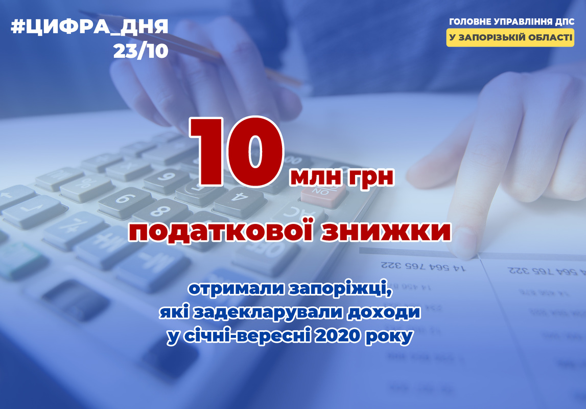 У рамках кампанії «Декларування 2020» правом на податкову знижку скористались 4 740 запоріжців. За повідомленням Головного управління ДПС у Запорізькій області, у результаті було виплачено 10 мільйонів 404 тисячі гривень.