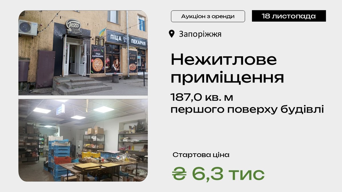 Оренда у Запоріжжі: нежитлове приміщення виставили на онлайн-аукціон. Торги призначені на 18 листопада 2025 року