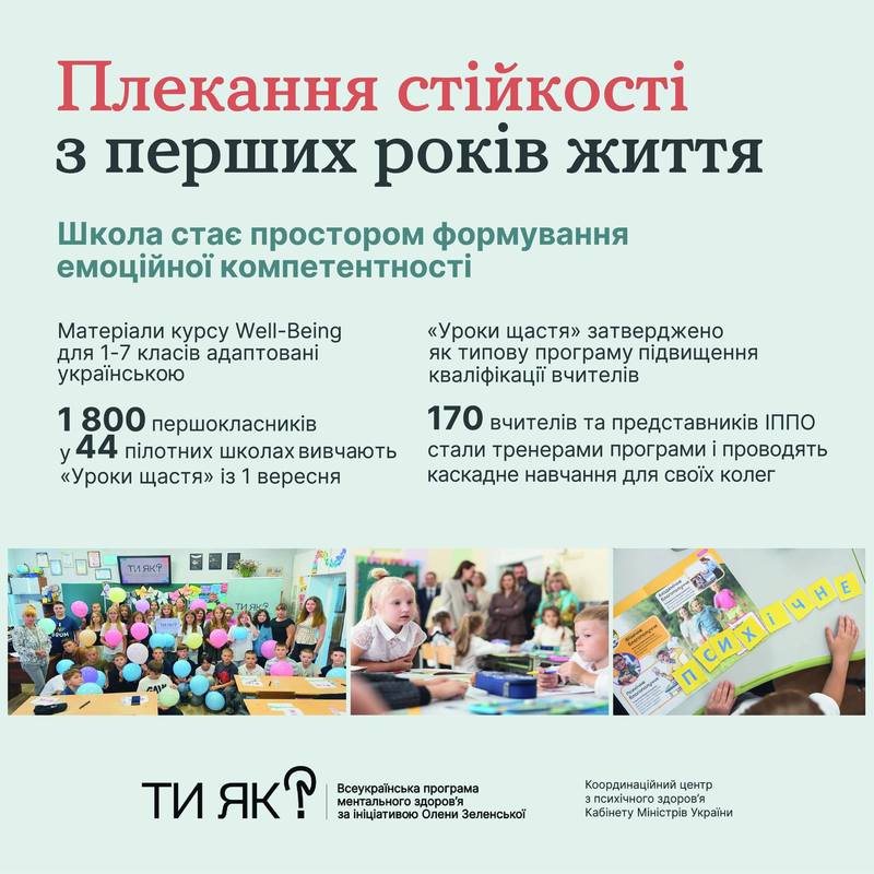- даптований американський курс соціально-емоційного навчання «Уроки щастя» впроваджено в 44 пілотних школах. І вже 31 заклад вищої освіти з 20 областей України об’єднує спільнота «Ти як?» (проєкт Міністерства освіти і науки України);