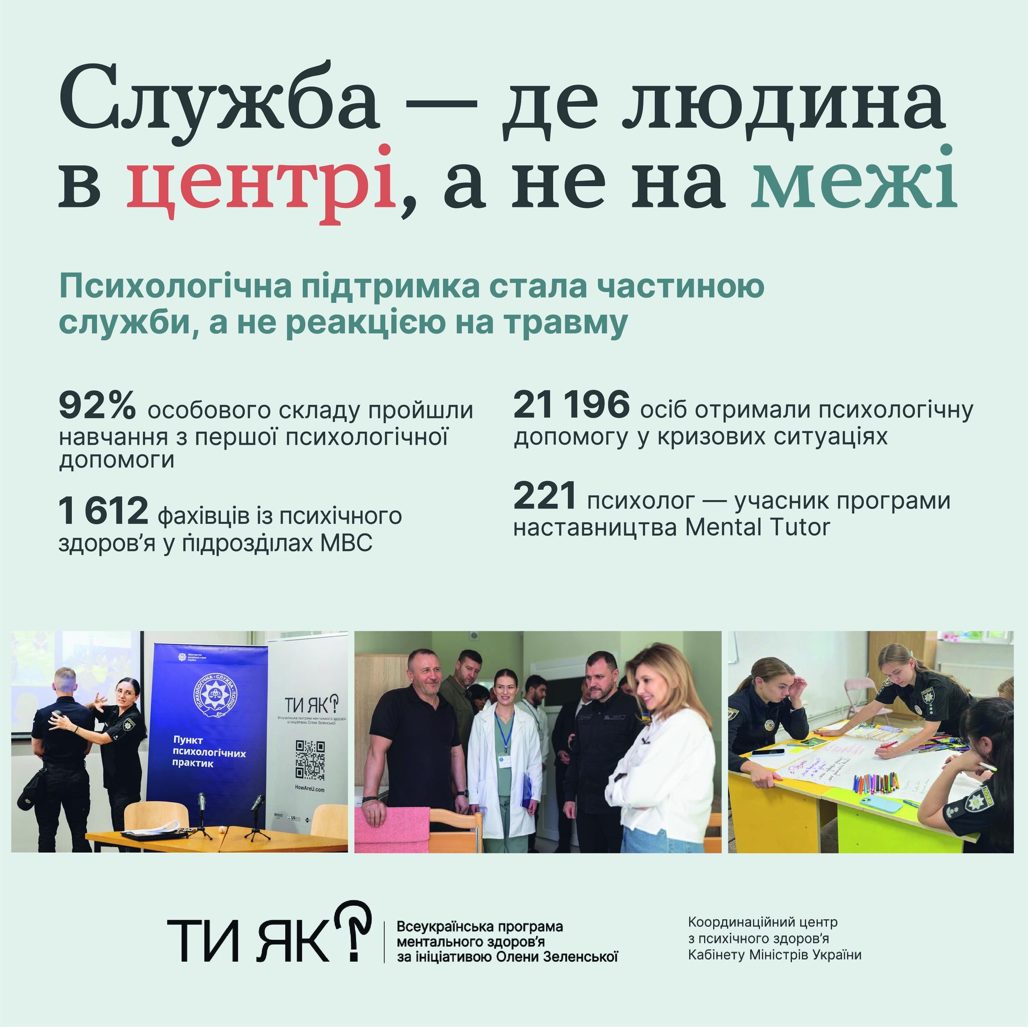 - 2 % особового складу Міністерства внутрішніх справ України пройшли навчання з першої психологічної допомоги, завдяки чому психологічну підтримку дістали майже 18,7 тис. постраждалих українців;