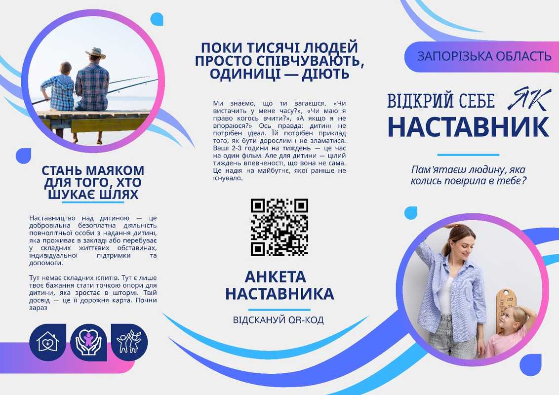 – Наставництво – це шанс змінити майбутнє дитини, приділяючи їй лише 2–3 години на тиждень. Сьогодні тисячі молодих людей в Україні потребують не просто опіки, а надійного дорослого, який допоможе повірити у власні сили. Ми запрошуємо кандидатів стати опорою для тих дітей, які опинилися у складних життєвих обставинах. Кожен, хто виявить бажання спробувати свої сили, пройде фахове навчання та отримає сертифікат, що підтверджує право бути наставником. Ваша увага може стати для дитини життєвим маяком. Допоможіть підлітку знайти свій шлях у доросле життя, – зауважила директорка Департаменту соціального захисту населення Запорізької ОДА Світлана Лисенко.