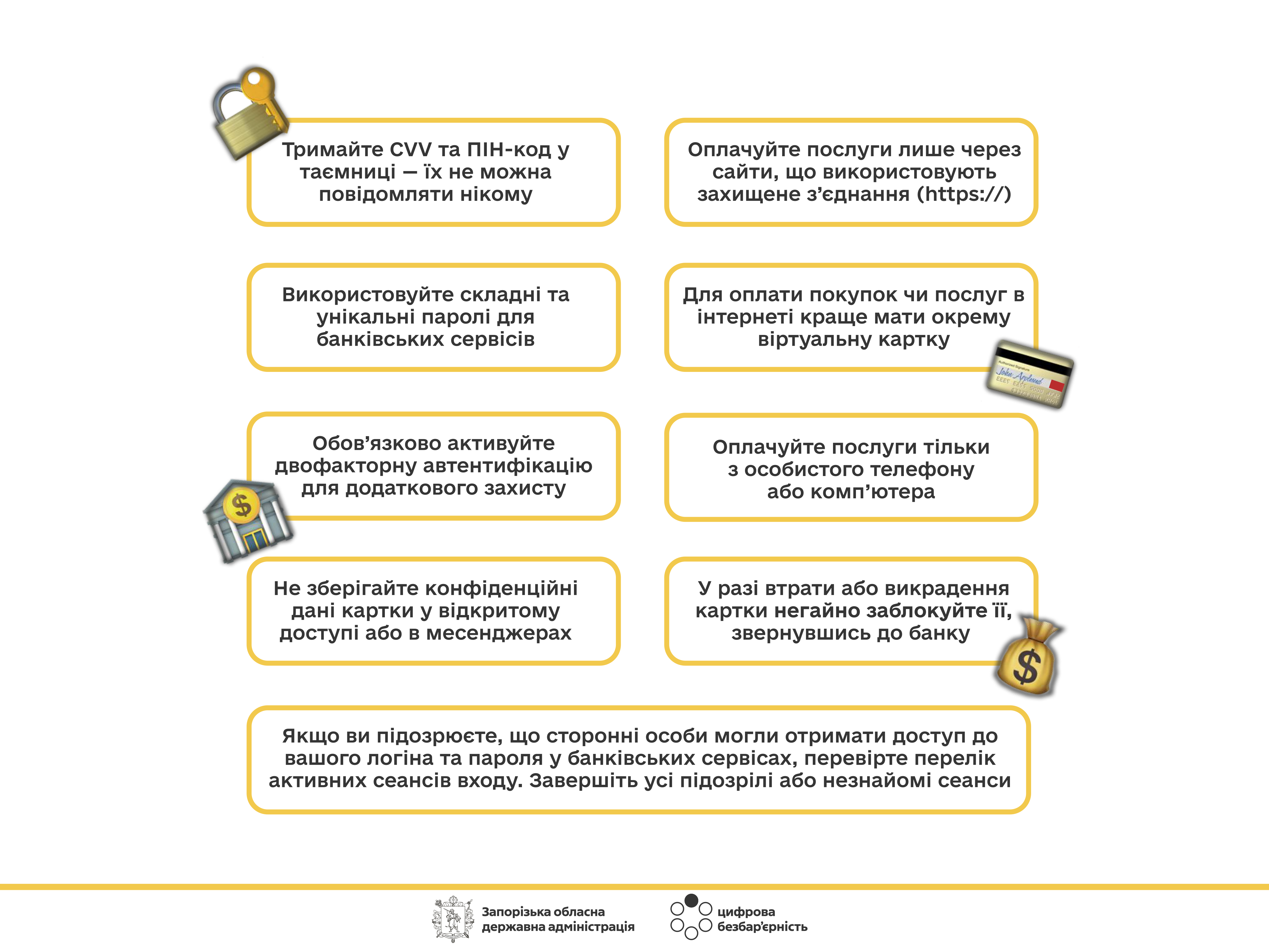 У сучасному цифровому світі питання безпеки фінансів є особливо актуальним. Нам стало зручніше здійснювати покупки із розвитком онлайн-банкінгу, безконтактної оплати, але разом із тим тепер легше стати жертвою шахраїв. Найголовніша мета аферистів обманом отримати ваші дані для подальших фінансових операцій, тому вони можуть видавати себе за працівників банку, залякувати блокуванням рахунків або ж надсилати посилання на фальшиві сайти, де користувач сам вводить дані своєї картки. Тому особливо важливо дотримуватися базових правил безпеки.