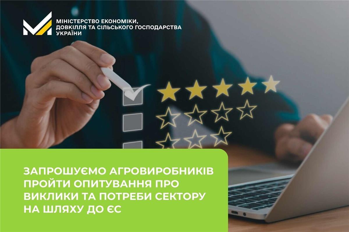 Міністерство економіки, довкілля та сільського господарства України запрошує представників аграрного сектору взяти участь в короткому анонімному опитуванні. Анкетування є частиною ініціативи «Україна на шляху до ЄС: регіональні діалоги із бізнесом у сфері сільського господарства».