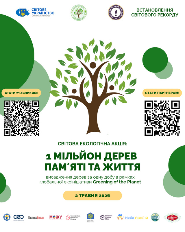 Благодійний фонд «Озеленення України» та Громадська організація «Світове українство» в межах реалізації глобальної екоініціативи Greening of the Planet та проєкту «Озеленення України», оголошує про проведення 2 травня 2026 року масштабної міжнародної екологічної акції «1 мільйон дерев пам’яті та життя», метою якої є об’єднання українців у різних країнах світу навколо спільної дії пам’яті та вдячності, увічнення пам’яті загиблих, популяризація екологічного відновлення України, а також встановлення світового рекорду з наймасовішої висадки дерев.
